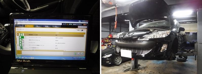 「プジョー308SW 車検整備(水漏れ修理 ➡ オイルフィルターブラケットガスケット + ウォーターポンプ交換 & タイミングチェーンテンショナー & Fブレーキパッド交換など)です。」