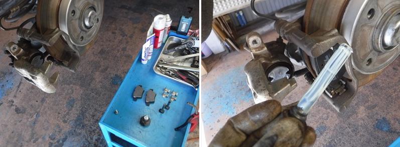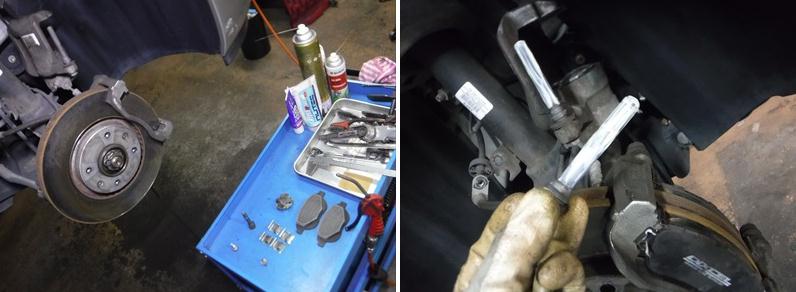 ブレーキパッドの面取りに、スライドピンなど各所グリスアップして組直し。
