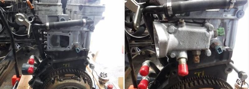 USEDのエンジンにオルタネーターやコンプレッサー、キャタライザーなど補機類を組み替えて載せ替え。