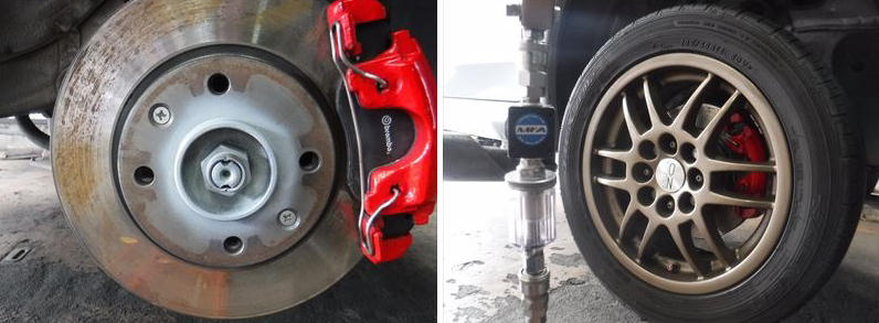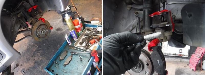 ブレーキパッドの面取りに、スライドピンなど各部グリスアップして組み戻し。