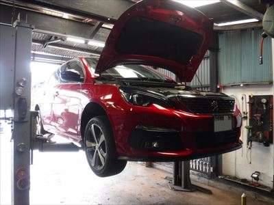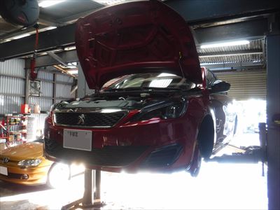こちらのプジョー308GTi 270 by プジョースポール クープフランシュは車検整備での入庫ですね。