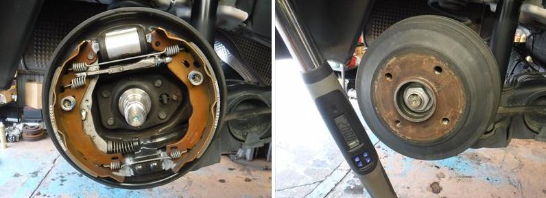 リアドラムのハブロックナットは新品を使用、規定トルクで締付後に回り止め。