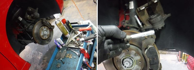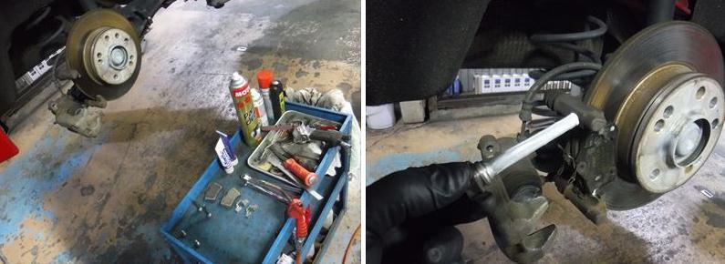 ブレーキパッドの面取りに、スライドピンなど各部グリスアップして組み戻し。