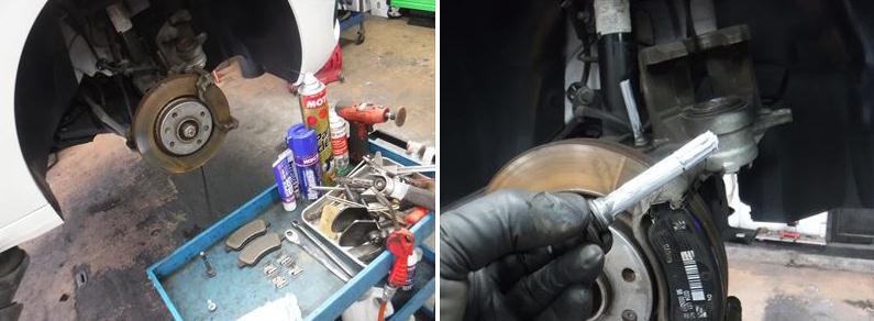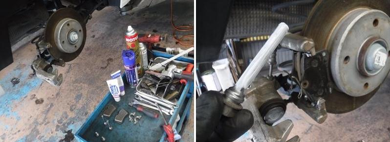 ブレーキパッドの面取りに、スライドピンなど各部グリスアップして組み戻し。