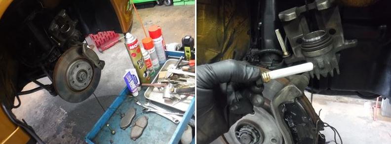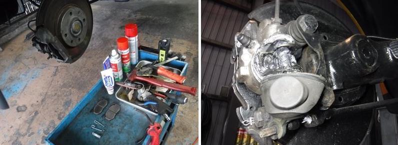 ブレーキパッドの面取りに、スライドピンなど各部グリスアップして組み戻し。