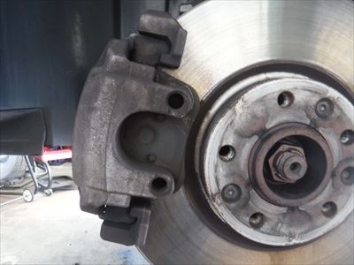 前回の他社での車検時にブレーキパッドが少ないと言われていたそうなので診たところ摩材がほぼ無いので…。