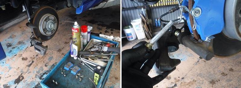 ブレーキパッドの面取りに、スライドピンなど各部グリスアップして…。
