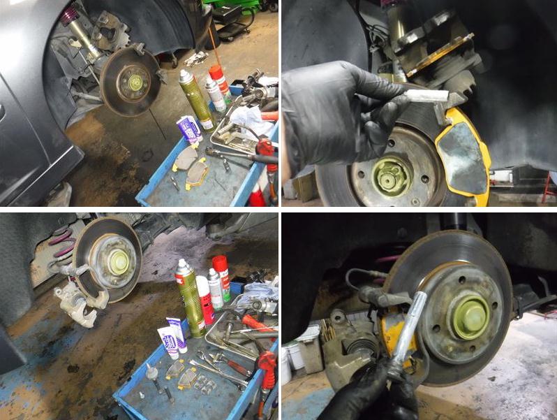 ブレーキパッドの面取りに、スライドピンなど各部グリスアップして組み戻し。