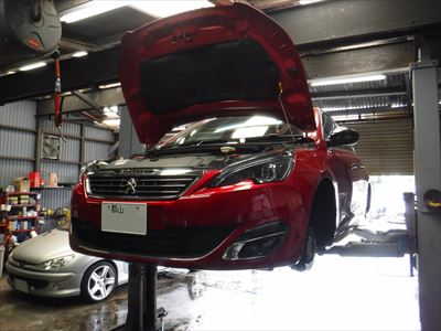 こちらのプジョー308GTライン アルティメットレッドは車検整備での入庫ですね。