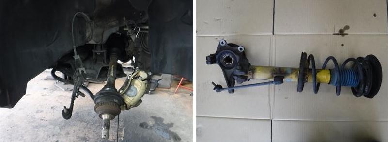 フロントショックアブソーバーを取り外して新品パーツに組み換え。