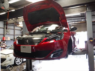 こちらのプジョー308GTライン アルティメットレッドは車検整備での入庫ですね。