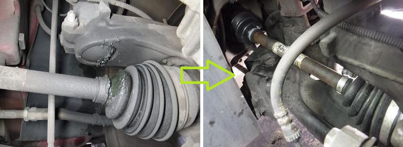 左側ドライブシャフトのアウターが切れているので、ドライブシャフトブーツIN+OUT新品交換。