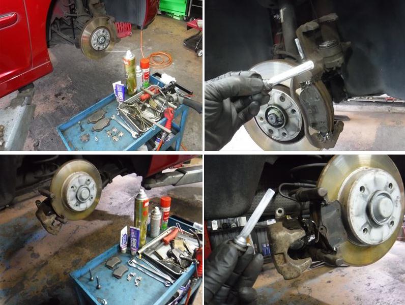 ブレーキパッドの面取りに、スライドピンなど各所グリスアップして組み戻し。