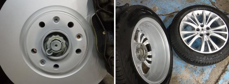 ホイールハブにはセラミックグリースを塗布して、アルミホイールは裏側まで洗浄です。