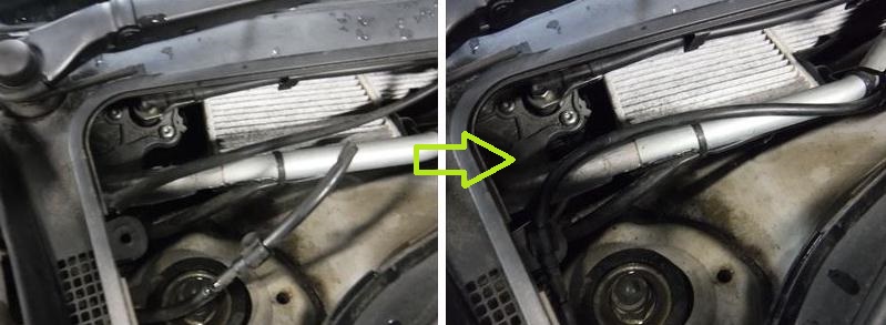 ウォッシャーが出ないとのことなので診てみたところ、ホースが切れていたので補修。
