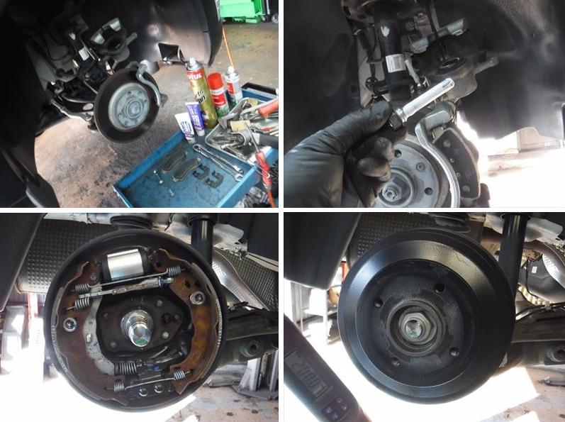 リアドラムのハブロックナットは新品を使用、規定トルクで締付後に回り止め。