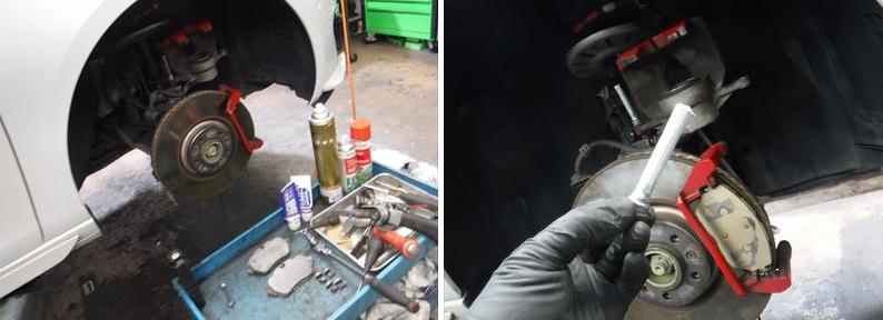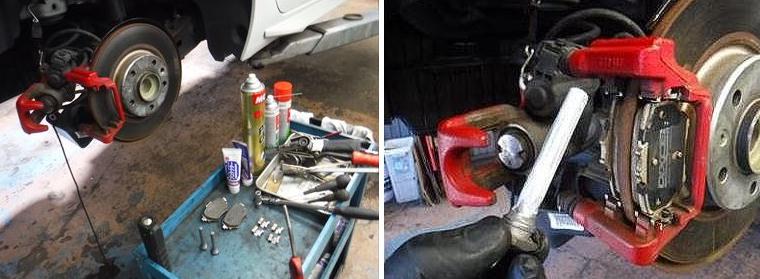 ブレーキパッドの面取りに、スライドピンなど各所グリスアップして組み戻し。