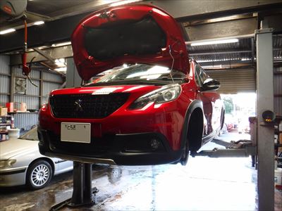 こちらのプジョー2008GTライン アルティメットレッドは車検整備での入庫ですね。
