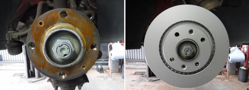 清掃後に高耐熱防錆グリースを塗布してから新品のディスクローターに交換。