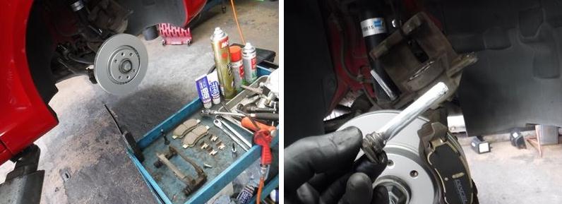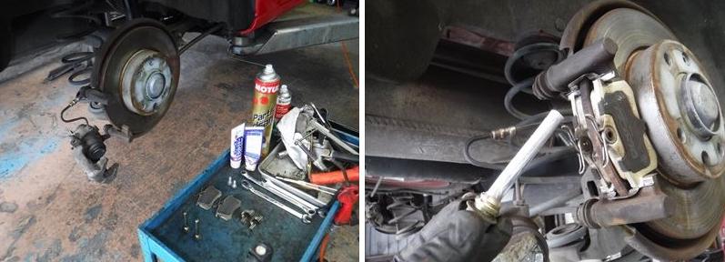 ブレーキパッドの面取りに、スライドピンなど各部グリスアップして…。